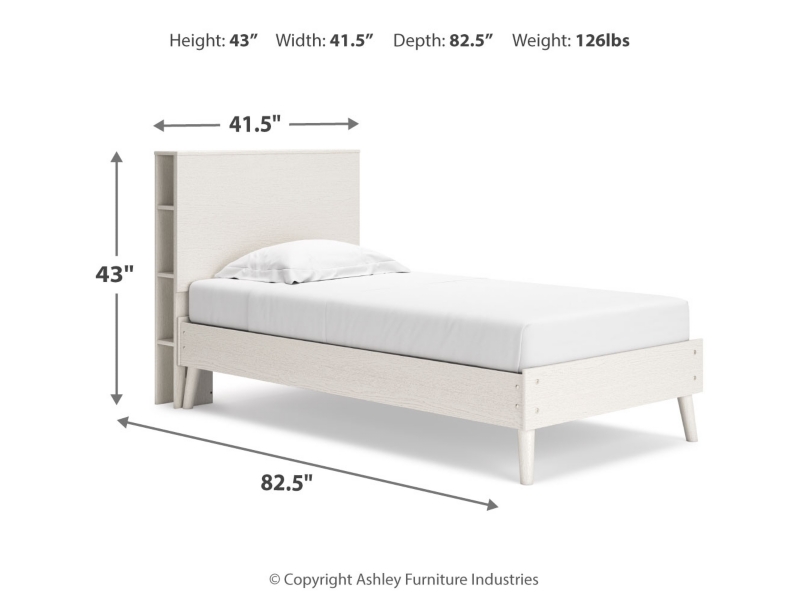 Dare to take minimalism to the max. This twin bookcase bed has an air of sleek simplicity thanks to its white painted finish with subtle replicated wood grain. A space-efficient storage option, cubbies along the side of the headboard ensure you can keep your favorite reads within reach. USB charging keeps up with your high-tech lifestyle. There's no doubt about it: This contemporary piece is sure to become a classic.