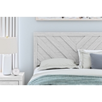 Charmingly designed, this king panel bed embraces the aesthetics of countryside living and repurposes them for modern settings. Its whitewash paint, replicating the wear and tear of time, appeals to your love of vintage character. And a chic chevron pattern on the headboard and footboard keeps your bedroom effortlessly on trend.