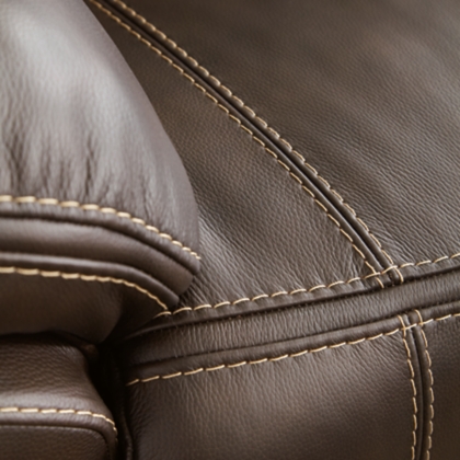 Load up on comfort in a cool, clean-lined and contemporary way with this power reclining sofa in chocolate brown. Rest assured, the leather match upholstery is enriched with a pebble grain effect for authentic appeal and enhanced with jumbo stitching for dramatic contrast. It features a one-touch power control with adjustable positions, along with an Easy View™ adjustable headrest that allows a primo view of the TV even when you're reclined. Extended ottomans provide extra length for leg comfort. A zero-draw USB plug-in at your fingertips lets you charge up as you chill out.