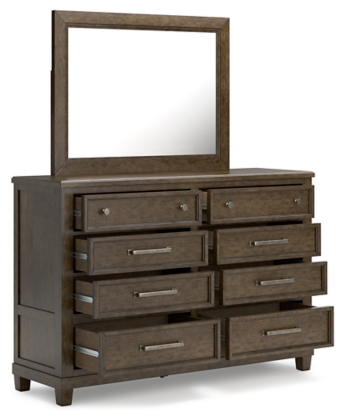 With its rich dark brown wood finish, this dresser with mirror gives modern farmhouse styling a substantial sensibility. Eight spacious drawers offer hidden storage for cozy sweaters and casual tees. The beautiful and sturdy silhouette elevates this dresser into a statement piece that’s timeless, functional and versatile.