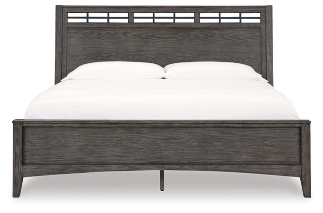 Cool and clean, yet warm and inviting. This queen panel bed has so many standout qualities, making it an inspired choice for your dream destination. A prime example of “casual contemporary” style at its very best, this designer bed is dressed to impress with an embossed wood grain texture. The subtly slanted headboard lets you sit comfortably when reading or working on your laptop in bed. And the medium gray-brown finish with a blackened wood grain contrast is wonderfully easy on the eyes.