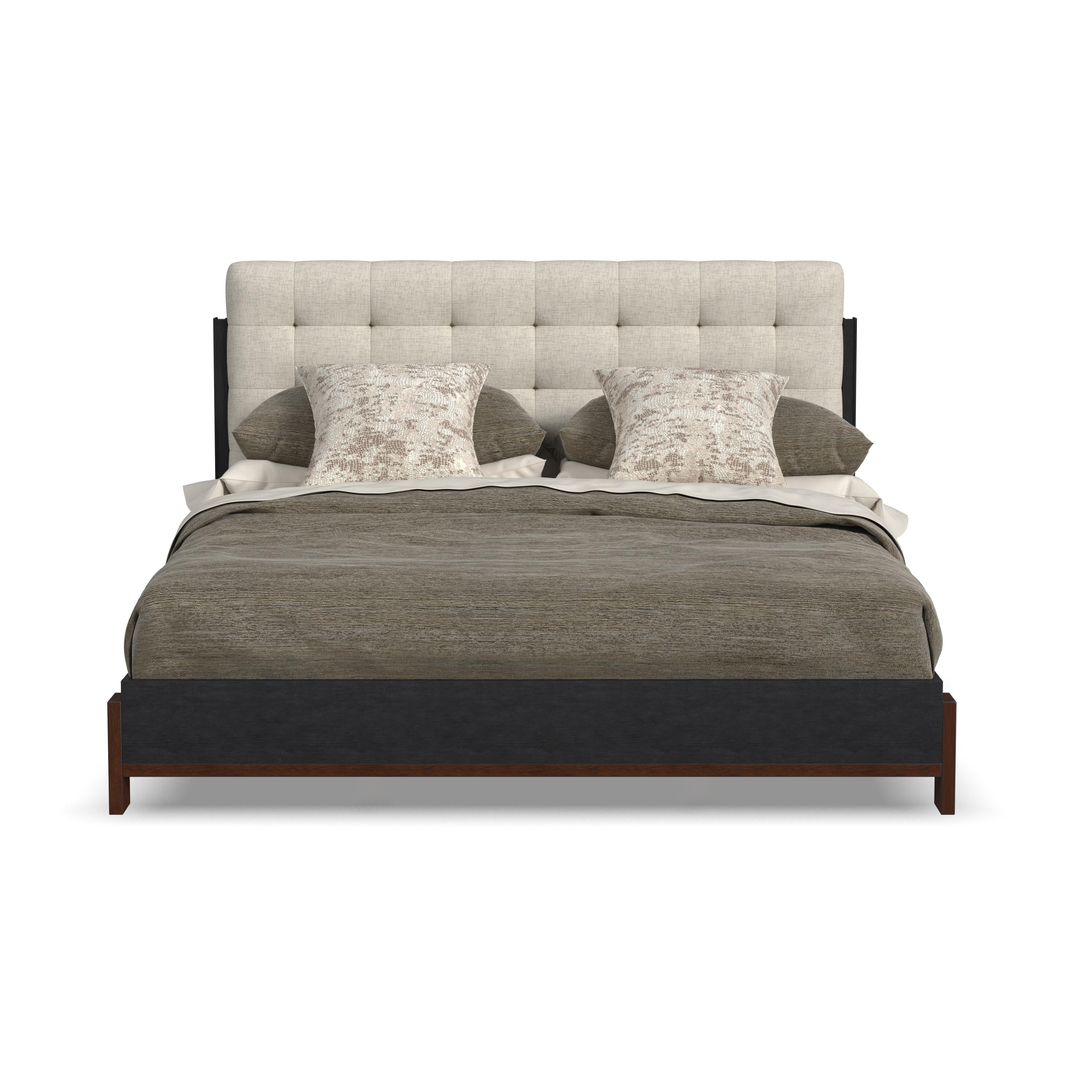 Add effortless style and architectural appeal to your bedroom with the Waterfall Queen upholstered bed. This platform-style bed features a timeless silhouette defined by clean lines and simple geometric shapes. Dark brown-finished base accents add a striking contrast to the deep ebony finish, while the elegantly tufted headboard brings an element of softness to the aesthetic. Expertly crafted from solid rubberwood and oak veneers, and upholstered with sustainable performance fabric, the Waterfall Queen bed offers lasting beauty you can feel good about.